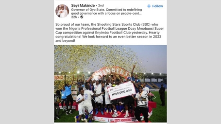 Governor Seyi Makinde Congratulates Shooting Stars on Dozy Mmobuosi Super Cup Victory