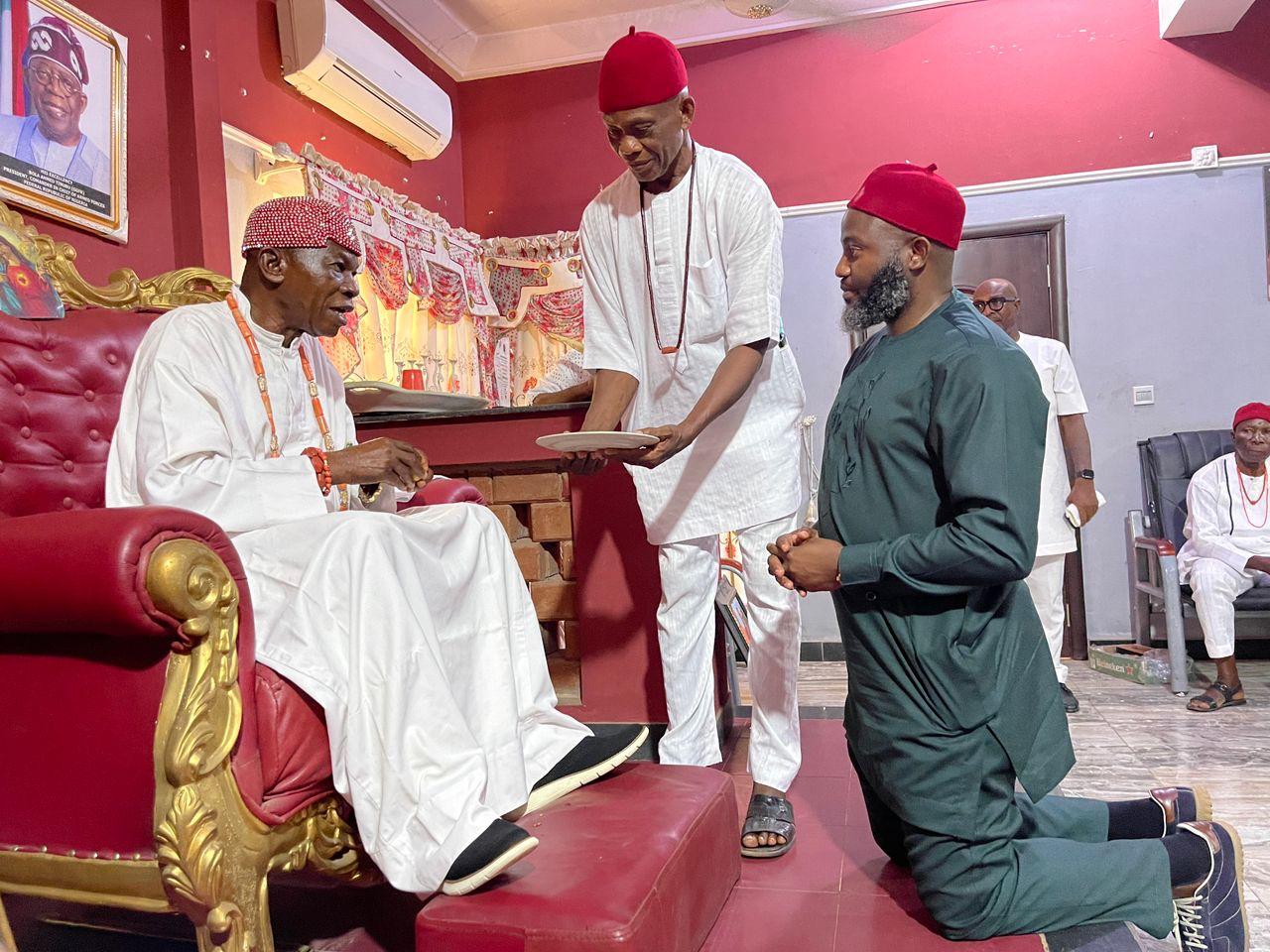 Dozy Mmobuosi paying respects kneeling before the Obi of Onicha-Ugbo.