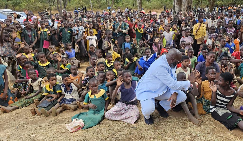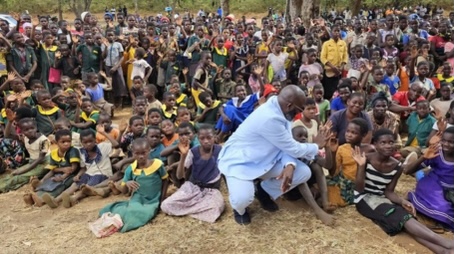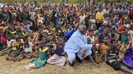 Dozy Mmobuosi engages with kids in Malawi's Palombe Village.